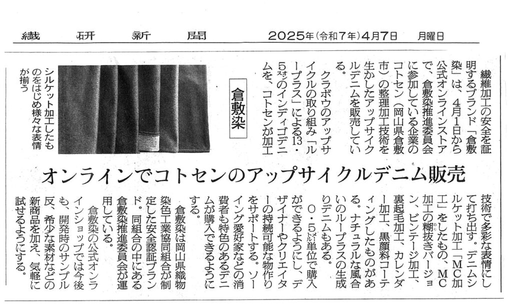 【メディア情報】繊研新聞:倉敷染オンラインでコトセンのアップサイクルデニム発売