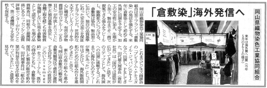 2023年9月26日 / 最終更新日時 : 2023年9月26日 kurashikizome お知らせ 【繊維ニュース】「倉敷染」海外発信への記事が掲載されました 2023年8月31日の繊維ニュースに「倉敷染」についての記事が掲載されました。 コメントを残す コメントをキャンセルメールアドレスが公開されることはありません。 ※ が付いている欄は必須項目ですコメント ※ 名前 ※ メール ※ サイト 次回のコメントで使用するためブラウザーに自分の名前、メールアドレス、サイトを保存する。 Δ