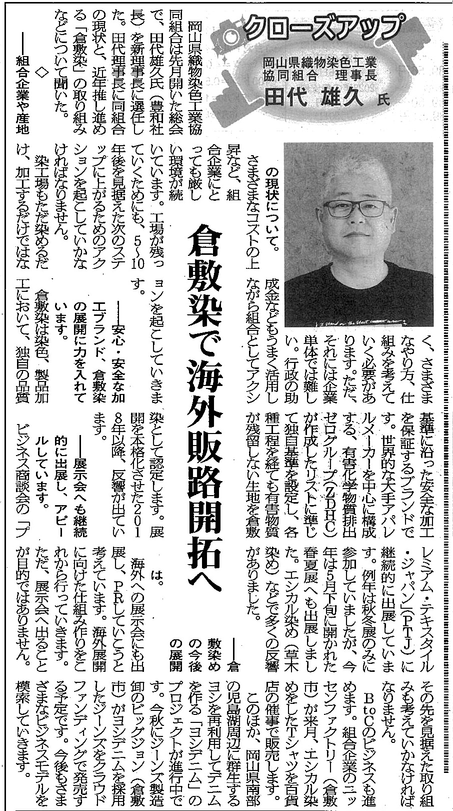 2023年6月27日 / 最終更新日時 : 2023年6月27日 kurashikizome お知らせ 【繊維ニュース】『新価値の創造へ』の記事で「倉敷染」が紹介されました 2023年6月27日付「繊維ニュース」『新価値の創造へ』の記事の中で倉敷染の取組みが紹介されました。