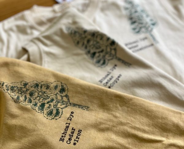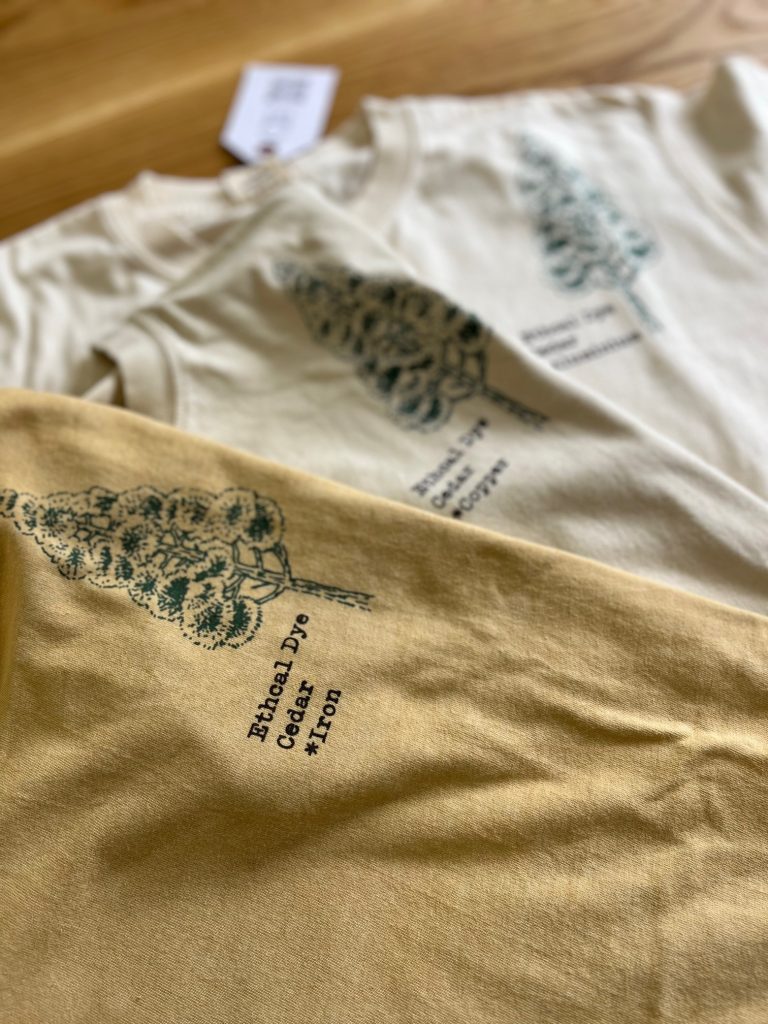 できるだけ地域の素材を使って染めたいという想いから、倉敷染の取り組みで、コーヒー染めや墨染め、岡山県北の製材所から出る樹皮を使ったエシカル染を始めました。これは日本古来の草木染を応用したもので、媒染剤によって色の出方が違うところが面白いんですよ。