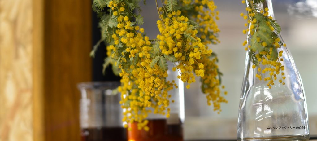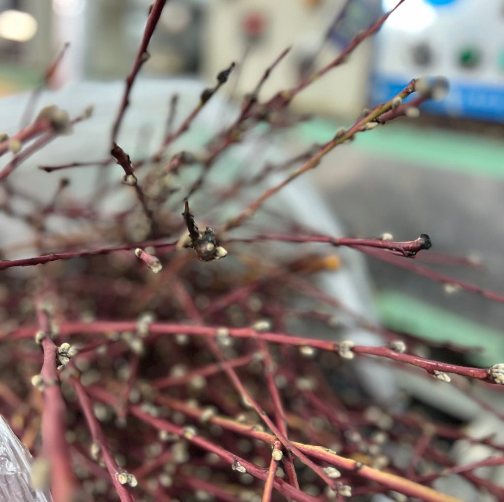2024SS企画では倉敷の桃農家さんの選定枝を使った桃染めや、児島湖のヨシを使ったヨシ染めにも挑戦しています。草木染をメインで担当をしているのは染色が好きでこの仕事に就いた女性スタッフで、時には一緒に畑まで染料になる材料を貰いに行ったりもしています。