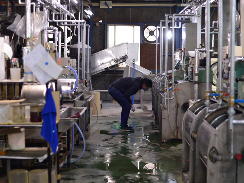 ニッセンは終戦直後に創業した染色工場で、主に学生服に使われる硫化染料による黒染めを生業としていました。その後、高度経済成長の大量生産時代に入り、1960年代に国産ジーンズが誕生することで生地の染色工場からデニム製品中心の洗い加工場へと転身しました。大手ジーンズブランドからの受注を捌くために設備も大きくなりました。
