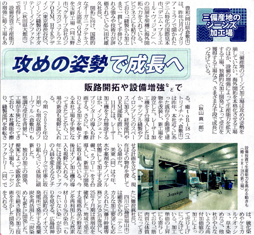 【メディア掲載】繊維ニュース/攻めの姿勢で成長へ ― 設備増強と販路拡大で三備産地を牽引