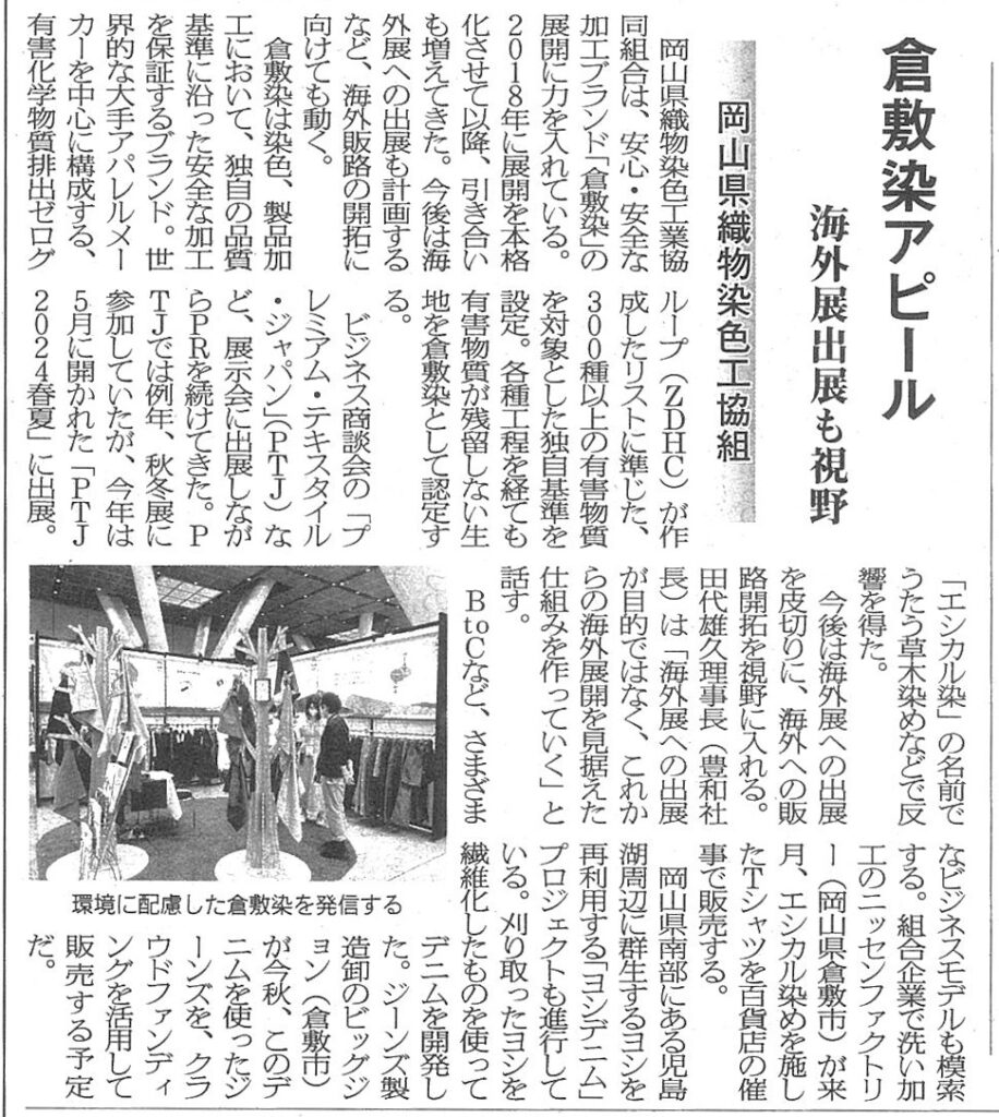 2023年6月27日 / 最終更新日時 : 2023年6月27日 kurashikizome お知らせ 【繊維ニュース】『新価値の創造へ』の記事で「倉敷染」が紹介されました 2023年6月27日付「繊維ニュース」『新価値の創造へ』の記事の中で倉敷染の取組みが紹介されました。 コメントを残す コメントをキャンセルメールアドレスが公開されることはありません。 ※ が付いている欄は必須項目ですコメント ※ 名前 ※ メール ※ サイト 次回のコメントで使用するためブラウザーに自分の名前、メールアドレス、サイトを保存する。 Δ