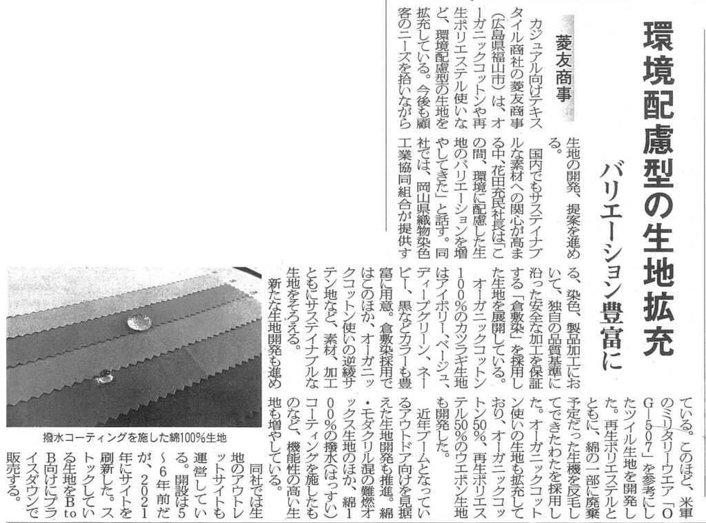 2023年6月27日 / 最終更新日時 : 2024年5月29日 kurashikizome お知らせ 【繊維ニュース】菱友商事の記事で「倉敷染」が紹介されました 2023年6月27日付「繊維ニュース」『新価値の創造へ』の菱友商事株式会社の記事の中で倉敷染の取組みが紹介されました。