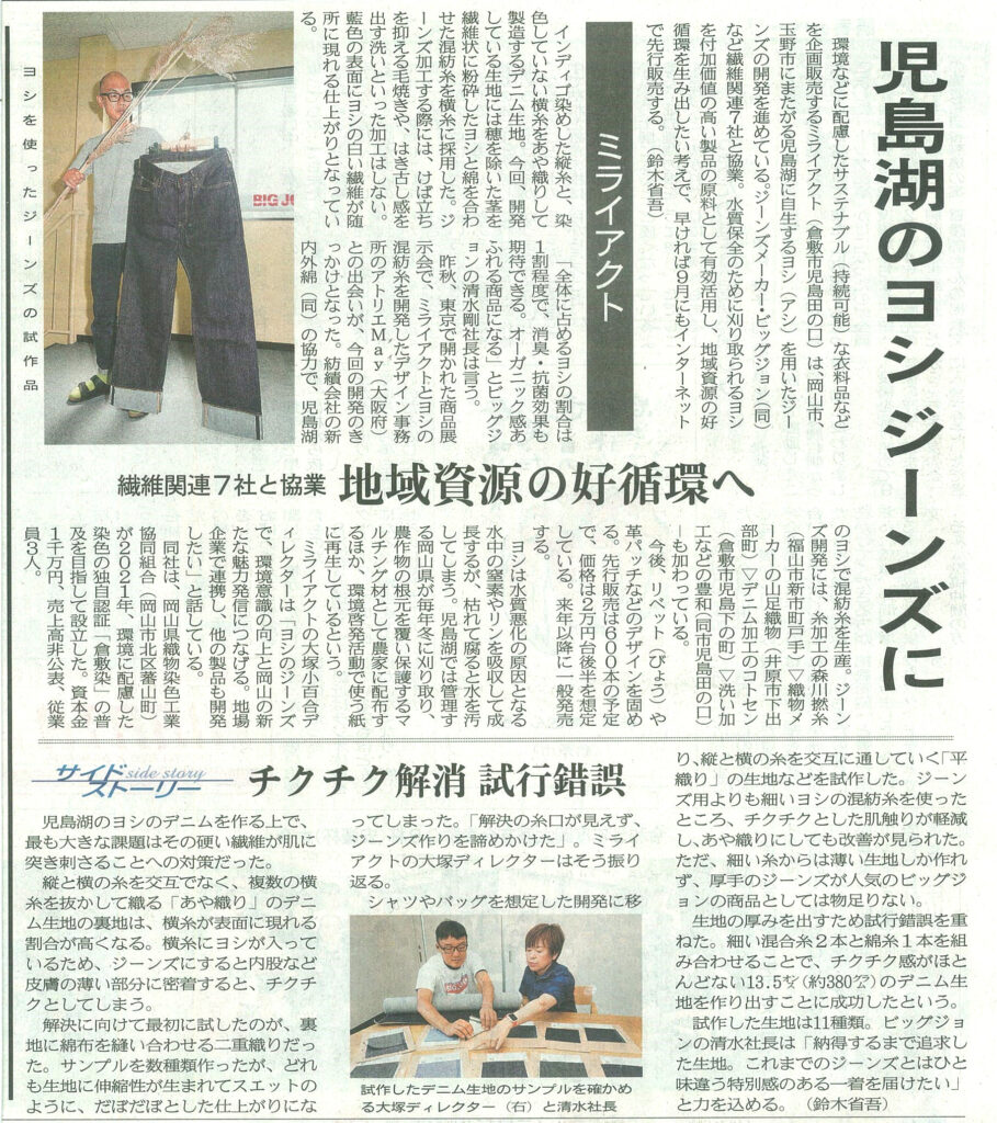 2023年8月23日 / 最終更新日時 : 2023年8月23日 kurashikizome お知らせ 【山陽新聞】倉敷染児島湖ヨシDenimの記事が掲載されました 2023年8月23日の山陽新聞に【倉敷染 児島湖ヨシデニム】についての記事が掲載されました。地域資源の好循環を目指した協業プロジェクトです。完成したジーンズは、今後クラウドファンディングを皮切りに販売されます。 コメントを残す コメントをキャンセルメールアドレスが公開されることはありません。 ※ が付いている欄は必須項目ですコメント ※ 名前 ※ メール ※ サイト 次回のコメントで使用するためブラウザーに自分の名前、メールアドレス、サイトを保存する。 Δ