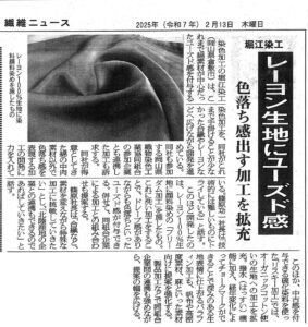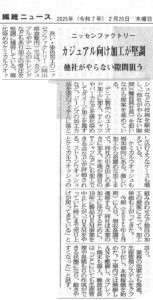 2025年2月7日の繊維ニュースにて、豊和の記事が掲載されました。昨年12月にイタリア・ミラノで開催された「デニム・プルミエール・ヴィジョン」の報告や、海外向けの体制の強化について掲載されました。また、玉野工場がGOTSの認証を取得したことについてや、グループ工場である、オオダテソーイングファクトリー、岡山ビューティの縫製能力の向上についても触れられています。