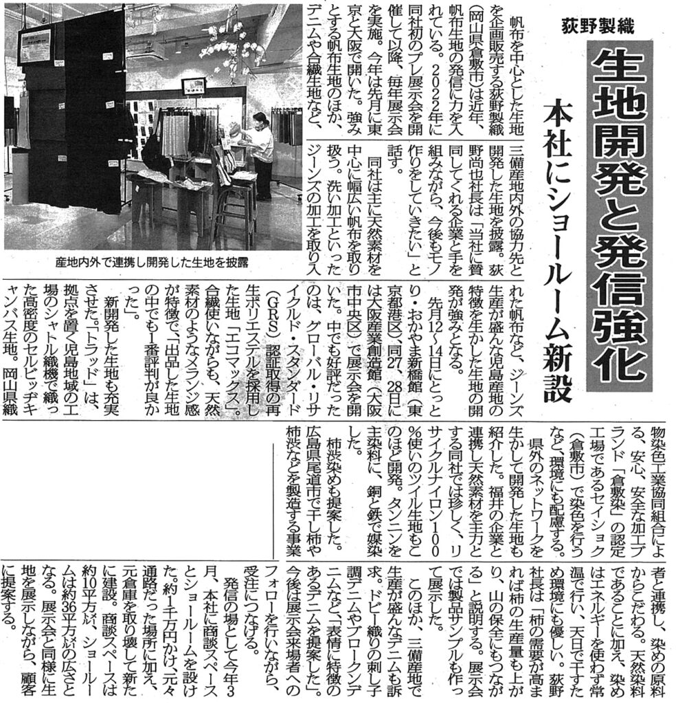 2024年7月11日 / 最終更新日時 : 2024年7月11日 kurashikizome お知らせ 【メディア情報】繊維ニュース 荻野製織の記事で倉敷染が紹介されました 2024年7月10日の繊維ニュースに掲載された、荻野製織の記事で倉敷染®が紹介されました。