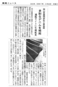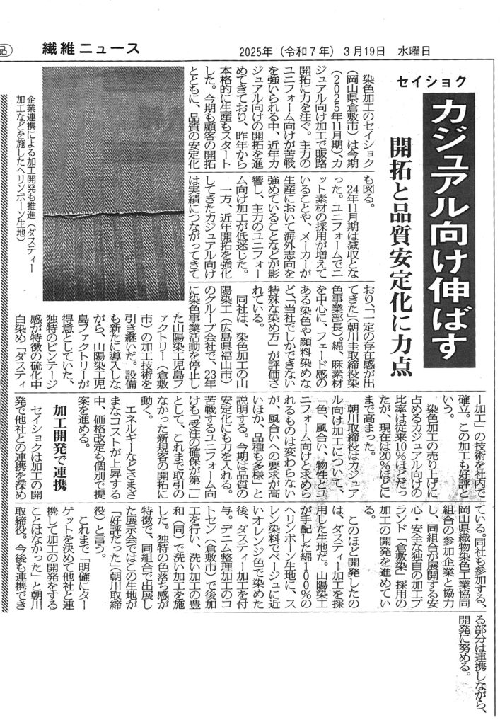 2025年3月19日の繊維ニュースに、セイショクがカジュアル向けに販路開拓と生産をスタートした記事が掲載されました。