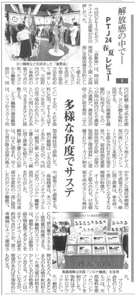 2023年6月20日 / 最終更新日時 : 2023年6月20日 kurashikizome お知らせ 【繊維ニュース】PTJ春夏レビューの記事で「倉敷染」が紹介されました 2023年6月19日付「繊維ニュース」PTJ春夏レビューの記事の中で倉敷染が紹介されました。 コメントを残す コメントをキャンセルメールアドレスが公開されることはありません。 ※ が付いている欄は必須項目ですコメント ※ 名前 ※ メール ※ サイト 次回のコメントで使用するためブラウザーに自分の名前、メールアドレス、サイトを保存する。 Δ